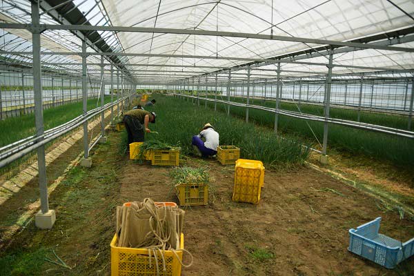 ビニールハウスでねぎを収穫